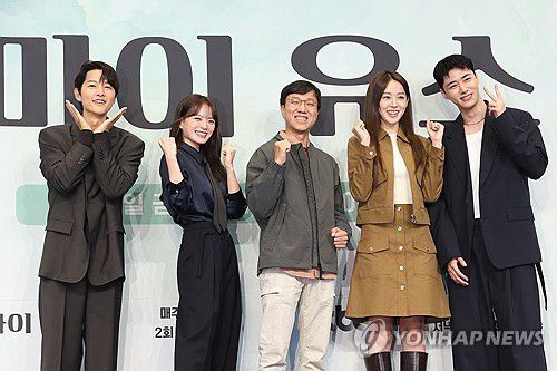 (서울=연합뉴스) 강민지 기자 = 4일 서울 구로구 더링크서울호텔에서 열린 JTBC금요 드라마 '마이 유스'제작발표회에서 배우와 감독이 포즈를 취하고 있다. 왼쪽부터 송중기, 천우희, 이상엽 감독, 이주명, 서지훈. 2025.9.4