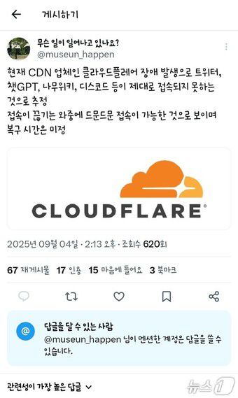 이를 두고 일각에선 글로벌 인터넷 인프라를 담당하는 클라우드플레어 서버에서 장애가 발생했을 것으로 추정했다.
