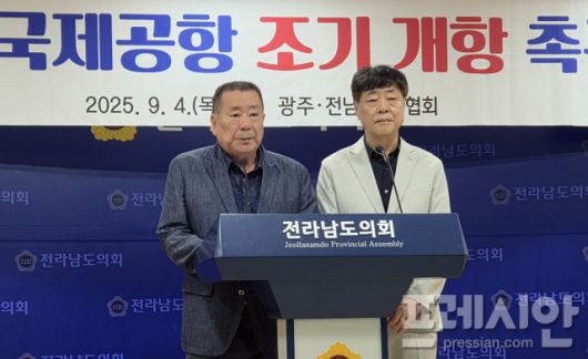 ▲4일 오후 전남도의회 브리핑룸에서 광주·전남관광협회 등 5개 단체(이하 단체) 소속원 50여명이 무안국제공항 조기개항을 촉구하며 기자회견을 하고 있다.2025.09.04ⓒ프레시안(박아론) |