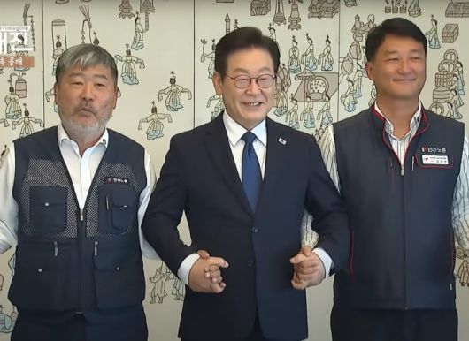이재명 대통령이 4일 용산 대통령실에서 김동명(왼쪽) 한국노총 위원장, 양경수(오른쪽) 민주노총, 양대 노총 위원장을 초청해 오찬 간담회를 하면서 손을 맞잡고 기념사진을 찍고 있다. [사진=KTV] |