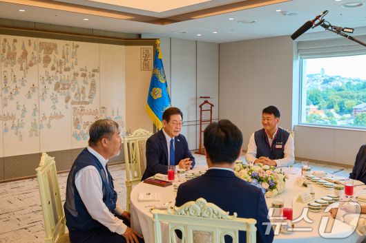 (서울=뉴스1) 허경 기자 = 이재명 대통령이 4일 서울 용산 대통령실 청사에서 열린 양대 노총 위원장과 오찬 간담회에서 양경수 민주노총 위원장, 김동명 한국노총 위원장과 대화하고 있다. (대통령실 제공. 재판매 및 DB 금지) 2025.9.4/뉴스1