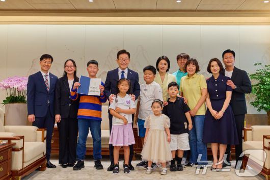 (서울=뉴스1) 허경 기자 = 이재명 대통령과 김혜경 여사가 4일 서울 용산 대통령실 청사에서 열린 어린이 초청 행사에서 참석자들과 함께 기념촬영을 하고 있다. (대통령실 제공. 재판매 및 DB 금지) 2025.9.4/뉴스1neohk@news1.krCopyright ⓒ 뉴스1. All rights reserved. 무단 전재 및 재배포, AI학습 이용 금지.