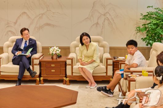 (서울=뉴스1) 허경 기자 = 이재명 대통령과 김혜경 여사가 4일 서울 용산 대통령실 청사에서 열린 어린이 초청 행사에서 참석자들과 대화하고 있다. (대통령실 제공. 재판매 및 DB 금지) 2025.9.4/뉴스1neohk@news1.krCopyright ⓒ 뉴스1. All rights reserved. 무단 전재 및 재배포, AI학습 이용 금지.