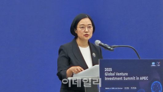 한성숙 중소벤처기업부 장관이 4일 제주 제주국제컨벤션센터(ICC)에서 열린 ‘2025 글로벌 벤처투자 서밋 in APEC’에서 환영사를 하고 있다.(사진=김세연기자) |