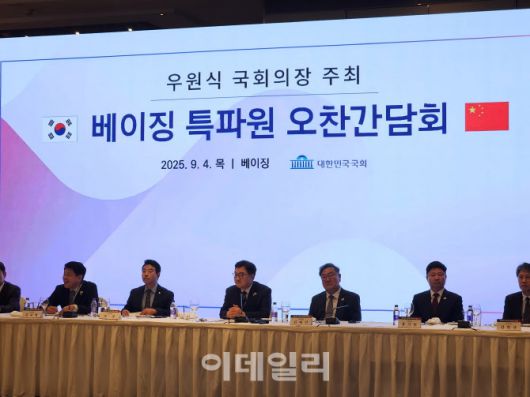 우원식(왼쪽에서 세번째) 국회의장을 비롯해 방중 대표단이 4일 오후 중국 베이징 캠핀스키 호텔에서 베이징 특파원 오찬 간담회에 참석해 있다. (사진=이데일리 이명철 특파원) |