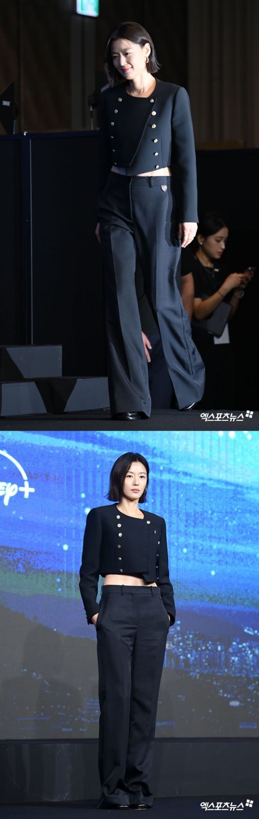 전지현은 지난 2일 열린 '북극성' 제작발표회에 크롭 더블 버튼 재킷과 블랙팬츠를 매치한 패션으로 시크한 분위기를 자랑했다.