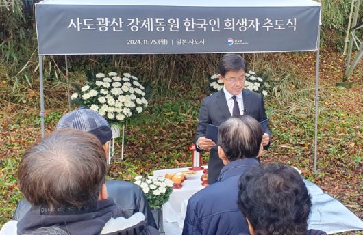 ▲ 지난해 11월 25일 일본 니가타현 사도 광산 조선인 기숙사 터에서 열린 사도 광산 강제동원 한국인 희생자 추도식에서 박철희 주일 한국대사가 추도사를 하고 있다. 당시 추도식 참석을 위해 유족들이 현장에 갔지만 일본의 과거사에 대한 부적절한 태도로 정부는 일본이 주관하는 추도식에 참석하지 않고 별도의 추도식을 마련했다. ⓒ연합뉴스 |