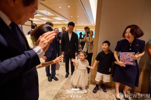 [서울=뉴스핌] 이재명 대통령과 김혜경 여사가 4일 서울 용산 대통령실을 찾은 어린이들과 인사를 하고 있다. [사진=대통령실] 2025.09.04 photo@newspim.com