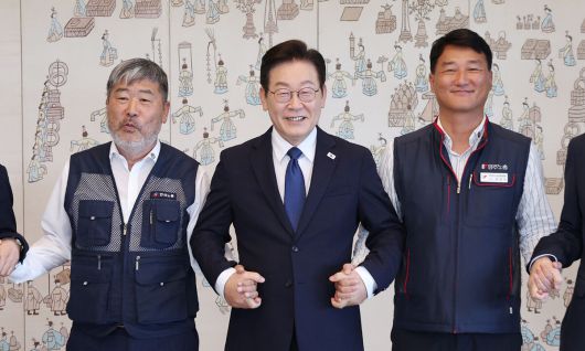 노동계 손잡고 기념촬영 이재명 대통령이 4일 서울 용산 대통령실에서 양대 노총 위원장 오찬에 참석해 김동명 한국노총 위원장(왼쪽), 양경수 민주노총 위원장과 손을 잡은 채 기념촬영을 하고 있다. 남정탁 기자 |
