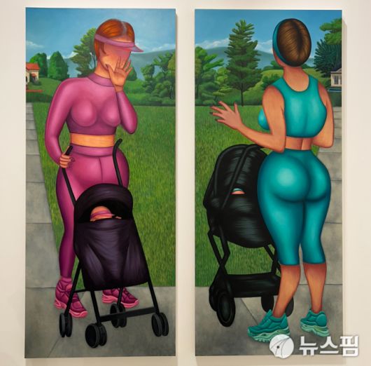 이번에 프리즈 서울에 출품된 커티스의 작품 '플로리다 엄마들(Florida Moms)'은 미국 남부 플로리다에 사는 젊은 엄마들의 모습을 묘사했다. 화려한 색감과 함께, 과장된 신체표현으로 두 여성을 독특하게 표현했다. 인물은 한편으론 밝고 유쾌해 보이지만 웬지 불안감이 감춰진 듯해 양가적 면모를 보여준다. 사실적 표현이나 초현실적인 분위기가 감돌아 흥미를 더한다.