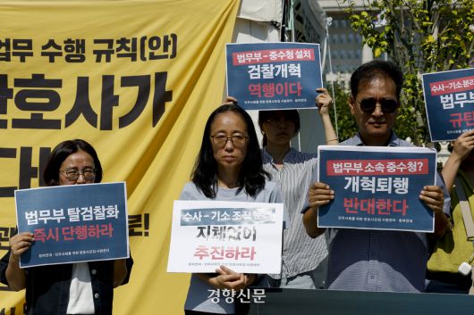 참여연대와 민주사회를위한변호사모임이 3일 국회 앞에서 법무부 소속 중수청 설치를 규탄하는 기자회견을 열고 있다. 문재원 기자