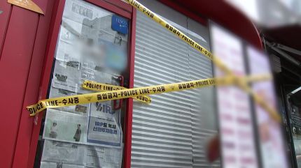 가게 출입문에 신문지가 붙어있고, 주변이 통제됐습니다.