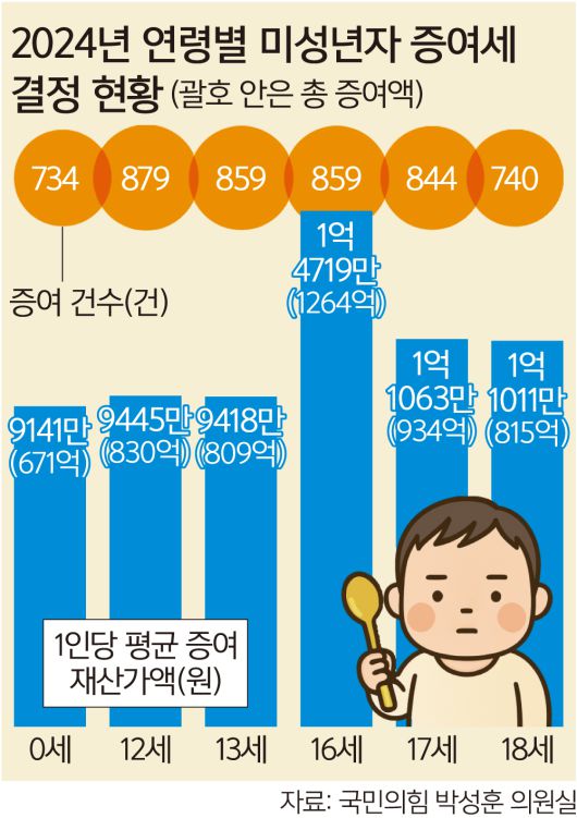 지난해 734명의 아이가 태어나자마자 평균 1억원에 육박하는 재산을 증여받은 것으로 나타났다. 미성년자(0∼18세) 전체 증여는 총 1조2382억원에 달했다.