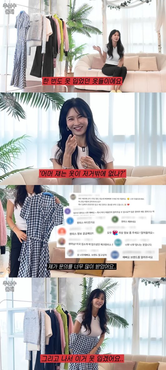 이날 하원미는 "제가 여태 하원미 채널을 하면서 사람들이 많이 물어봤던 옷이랑 몇 개 안 되지만 방송 출연을 했지 않냐. 거기서 입은 옷들을 궁금해하셔서 가지고 왔다"라며 옷들을 소개했다.