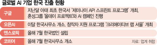 글로벌 인공지능(AI) 기술 기업들이 한국 시장을 적극 공략하고 있다. 생성형 AI 제미나이에 이미지 편집과 비디오 생성 등 고도화된 기능을 최근 탑재한 구글은 미래 주요 고객으로 성장할 스타트업과 대학생들까지 겨냥했다. 앤스로픽과 코히어 등 주요 AI 스타트업은 한국 법인을 세우고 시장을 개척하고 있다.