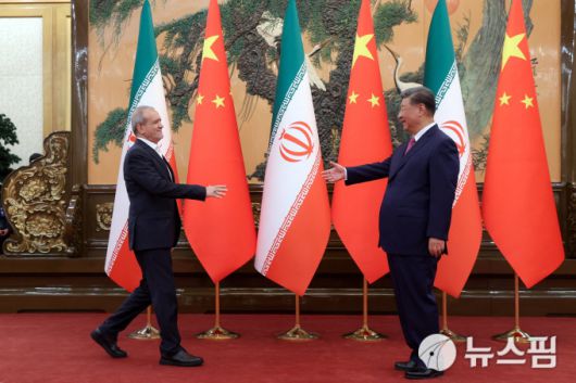 마수드 페제시키안(왼쪽) 이란 대통령과 시진핑 중국 국가주석이 지난 2일(현지시간) 중국 베이징에서 양자 회담을 갖기 위해 만나고 있다. [사진=로이터 뉴스핌] |
