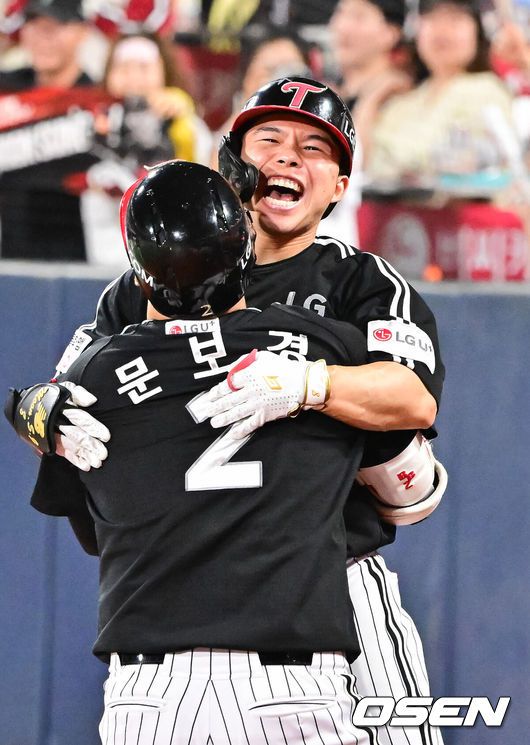 [OSEN=수원, 박준형 기자] 4일 오후 수원 KT 위즈 파크에서 ‘2025 신한 SOL BANK KBO리그’ KT 위즈와 LG 트윈스의 경기가 진행됐다. 이날 경기 KT는 문용익을, LG는 송승기를 선발투수로 내세웠다.8회초 1사 만루 LG 문성주가 역전 만루홈런을 날리고 문보경과 포옹을 하고 있다. 2025.09.04 / soul1014@osen.co.kr |