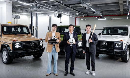 4일 HS효성더클래스 메르세데스-벤츠 방배 서비스센터에서 열린 ‘G클래스 스트롱거 댄 더 1980 에디션’ 출시 기념 행사에서 80년대 전성기를 누린 축구 스타 차범근(가운데)과 80년대생 야구선수 추신수(오른쪽), 80년대 시대극에 출연한 배우 이동휘가 기념촬영을 하고 있다. 이 모델은 1979년 처음 출시돼 80년대 인기를 누린 G클래스 시리즈 W460에 대한 헌정 목적으로 제작된 한정판이다.