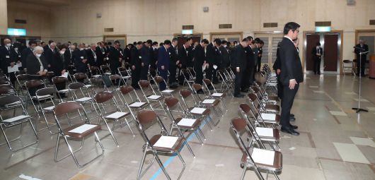 24일 일본 니가타현 사도시 아이카와 개발종합센터에서 열린 ‘사도광산 추도식’에서 이쿠이나 아키코 외무성 정무관(차관급) 및 참석자들이 추모 묵념을 하는 가운데 한국 정부 관계자 및 유가족의 자리가 비어 있다. 2024.11.24 뉴스1 |