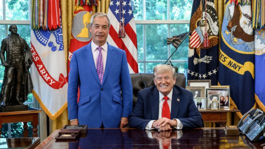 미국을 방문 중인 나이젤 패라지 영국개혁당 대표(왼쪽)가 3일 백악관에서 도널드 트럼프 미 대통령과 만나 기념 촬영을 하고 있다. /X(옛 트위터) |