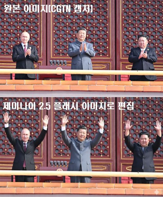 북중러 3국 정상이 톈안먼 망루에 나란히 선 사진을 가지고 이미지를 편집해봤습니다. '세 사람이 만세 외치는 모습으로 바꿔줘' 이렇게 짧은 명령어만 입력했습니다.