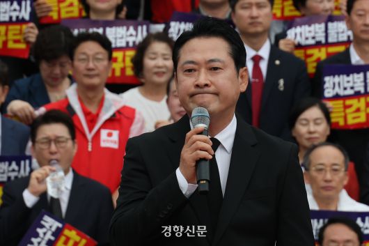 장동혁 국민의힘 대표가 지난 4일 국회 본청 계단에서 열린 야당말살 정치탄압 특검수사 규탄대회에서 대정부 투쟁 등을 선언하며 규탄 연설을 하고 있다. 성동훈 기자 |