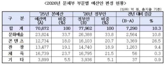 문체부는 K콘텐츠 투자 확대를 뼈대로 하는 2026년 예산안을 5일 공개했다. 내년 문체부 예산안은 7조7962억원으로 올해보다 7290억원(10.3%) 증가한다. 증가폭은 2020년 이후 가장 크다. 문체부는 확대된 예산으로 K-컬처의 성장을 가속화하고 국민들의 K-컬처 향유 기회를 더욱 확대하겠다고 밝혔다.