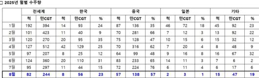 1~8월 전세계 누계 수주는 3448만CGT(1912척)로 전년 동기 4014만CGT(2190척) 대비 14% 감소했다. 이중 한국 891만CGT(251척, 26%), 중국은 1396만CGT(872척, 40%)를 기록했다. 전년 동기대비 각각 14%, 17% 감소했다.