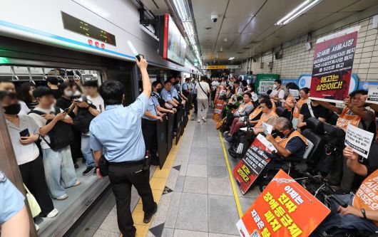 전장연은 이날 오전 7시 50분쯤 경기 과천시 지하철 4호선 선바위역에 정차한 상행선 열차에 탑승해 안전문을 막는 시위에 돌입했다. 이들은 40여분 뒤 해당 열차에서 하차했으나 다음 역인 남태령역으로 이동해 시위를 재개한 것으로 전해졌다.