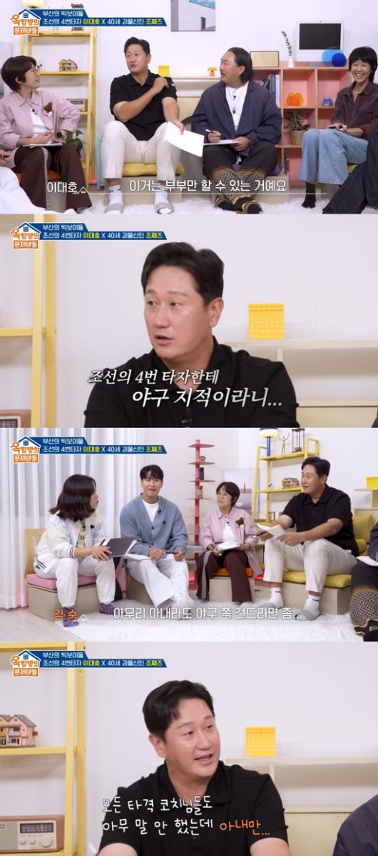 김숙은 이대호에게 "야구 쪽 건드리면 (화나지 않냐?)"라고 질문했다. 이대호는 "저는 누구든 나한테 야구 이야기하면 화낸다. 그런데 아내가 이야기하는 부분이 맞다. 모든 타격 코치님도 아무 말 안 했는데 아내만 (이야기한다)"라고 알렸다.