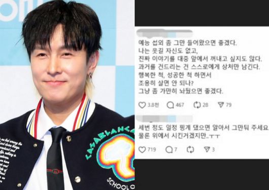 이어 "행복한 척, 성공한 척하면서 조용히 살면 안 되나. 그냥 좀 가만히 놔뒀으면 좋겠다"며 "세 번 정도 일정 핑계 댔으면 알아서 그만둬 주세요. 물론 위에서 시킨거겠지만"이라고 호소했다.