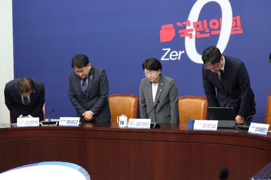 조국혁신당 김선민 당대표 권한대행을 비롯한 당 지도부가 5일 국회에서 열린 현안 관련 기자간담회에서 당내 성 비위 사건과 관련해 사과하고 있다. /남강호 기자 |