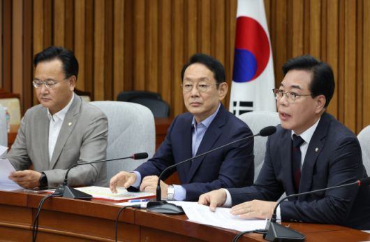 송언석(오른쪽) 국민의힘 원내대표가 5일 국회에서 열린 원내대책회의에서 발언하고 있다. 오른쪽부터 송 원내대표, 김도읍 정책위의장, 유상범 원내운영수석부대표. 연합뉴스 |
