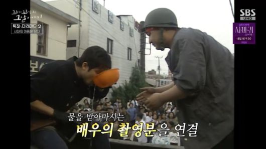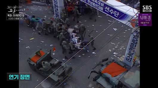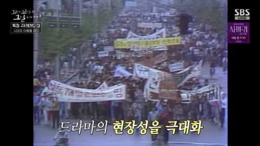 5.18 민주화운동 당시 물을 전달하는 실제 자료 영상에 물을 받아마시는 배우의 촬영분을 연결하는 등, '모래시계'는 드라마 곳곳에 실제 영상을 삽입해 드라마의 현장성을 극대화시켰어. 특히 5.18 광주 민주화운동 에피소드는 실제로 광주에서 촬영했는데, 촬영 현장을 지켜보던 광주 시민들이 보조출연을 자청했다고 해.