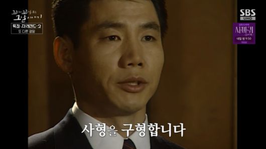 "세상엔 상식이란 게 있습니다. 무엇이 옳고, 무엇이 그른지, 물론 상식대로 사는 게 점점 어려워지는 시대라는 건 인정합니다. 피고인은 지난 30년간 살아오면서 여러 번 선택의 기로에 섰습니다. 그때마다 피고인은 좀 더 쉬운 길을 택했습니다. 자신의 힘을 사용하고, 힘 있는 자의 옆에 붙어서 지름길을 택했습니다. 본 검사는 범죄단체조직 및 폭력행위 등 처벌에 관한 법률에 의거, 사형을 구형합니다."