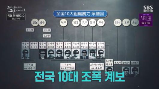 1980년대 왕성하게 활동했던, 전국 10대 조폭 계보야. 조폭과 손을 잡은 건 정덕진도 마찬가지였어. 정덕진은 특히, 서방파의 김태촌과 커넥션이 있었어. 김태촌 알아? 김태촌은 뉴송도호텔 사장 피습사건 주범으로, 징역 5년, 보호감호 10년을 선고받고 복역 중이었어. 그러다 폐암이 발병돼 수감 3년 만인 1989년도에 형집행정지로 석방됐어. 천하의 김태촌도 돈줄인 정덕진 앞에선 고개를 숙였다고 해. 조폭들도 언제부턴가 돈과 권력에 따라 움직이고 있었거든.