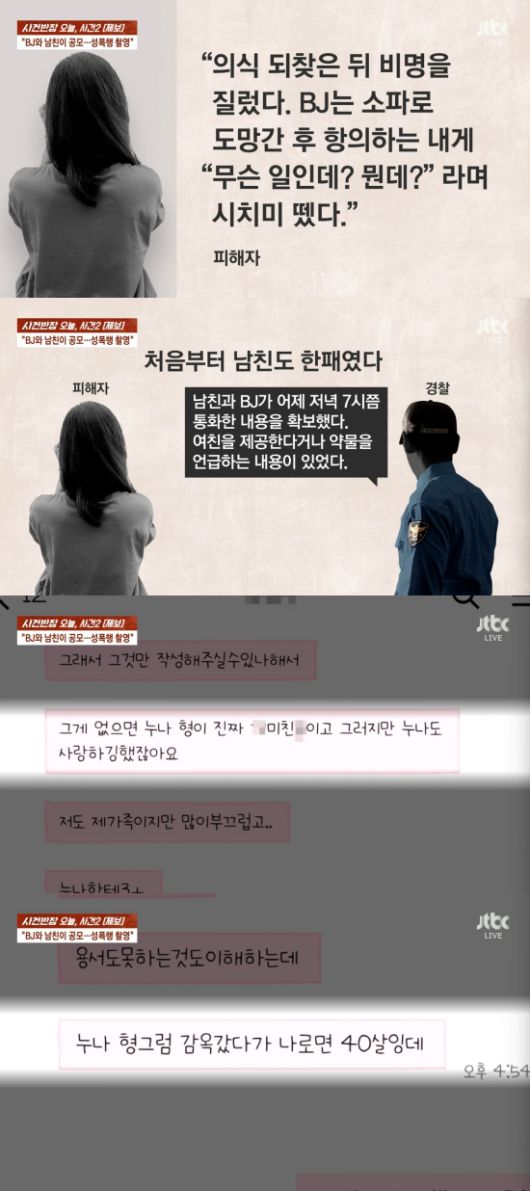 성폭행 직후 BJ는 시치미를 뗐고, 남자친구는 되려 화를 냈다고. 결국 신고를 받고 현장에 출동한 경찰은 즉각 BJ를 긴급체포했다. 피해자는 "남자친구가 가담했다는 내용을 믿고 싶지 않았아서 '얘는 잘못 없다'고 했더니, 경찰이 말하길 남자친구가 전날 7시쯤에 통화를 하면서 나한테 술에 약물을 먹이자고 했다고 계획을 짰다고 하더라"고 남자친구가 가담한 충격적인 사실을 털어놨다.