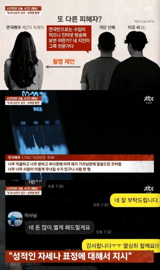 피해자인 40대 연극배우는 극단 선배가 연극만으로 먹고살기 쉽지 않으니 인터넷 방송을 하자며 위의 BJ를 소개시켜줬다고 했다. 돈을 많이 벌게 해주겠다고 보니 성적인 행위를 하는 방송이었다고 한다. 이 피해자는 "어떻게든 인터넷에서 영상과 사진을 찾아서 삭제 요청하는 방법밖에 없다. 너무 억울하고 분하다. 사람이 이렇게 무너질 수 있구나 싶다"며 고통을 호소했다.