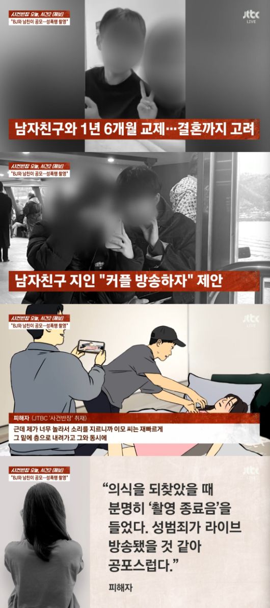 4일 방송된 JTBC '사건반장'에서는 30대 여성 제보자가 남자친구와 그의 지인인 BJ의 제안으로 커플 방송에 참여했다가 성폭행과 불법 촬영을 당한 사건을 조명했다.