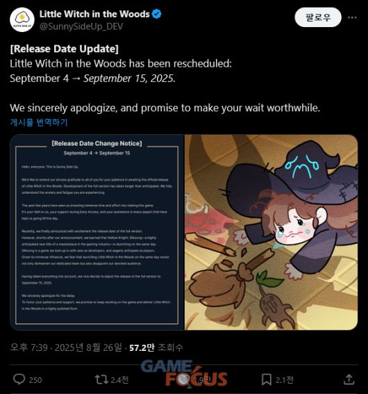 개발팀은 공지를 통해 '할로우 나이트: 실크송'은 개발자 입장에서 존경하며 동시에 게이머로서도 손꼽아 기다려온 작품으로 평가하며, “막대한 영향력을 지닌 이 작품과 같은 날 '숲 속의 작은 마녀'를 출시할 경우 개발팀은 물론 오랜 시간 게임을 기다려온 이용자들까지 실망하게 할 수 있다고 판단했다”며 일정 변경의 이유를 밝혔다.