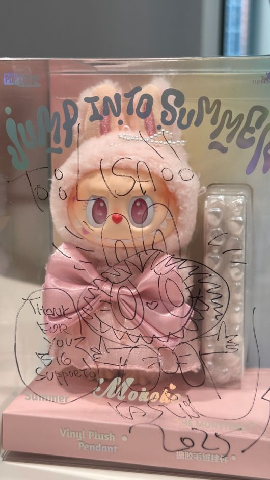 리사가 선물받은 제품은 최근 ‘Jump Into Summer’ 시리즈로 화제를 모은 ‘Vinyl Plush Pendant’로, 모코코로 특유의 귀여움과 핑크색 퍼 장식, 그리고 리본이 특징이다. 친필 사인과 함께 정성이 담긴 드로잉까지 더해져 리사에게 각별한 의미가 되었을 것으로 보인다.