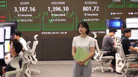지난ㄴ달 27일 서울 중구 하나은행 본점 딜링룸에서 직원들이 업무를 보고 있다. /연합뉴스 |