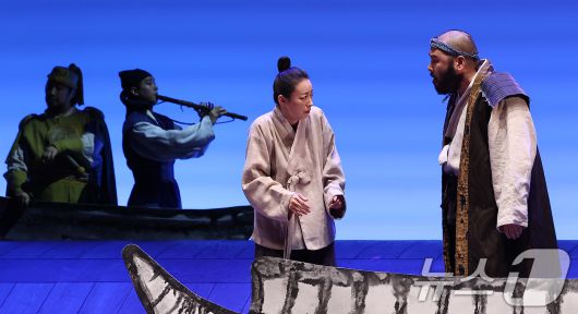 (서울=뉴스1) 김성진 기자 = 5일 서울 종로구 세종문화회관 M씨어터에서 열린 연극 '퉁소소리' 프레스콜에서 배우들이 연기를 펼치고 있다. '퉁소소리'는 조선 중기 작가 조위한의 소설 ‘최척전’을 원작으로 한 연극은 주인공 최척 일가가 30여년간 임진왜란과 정유재란, 명·청 교체기의 혼란을 겪으며 반복하는 만남과 헤어짐을 따라간다. 2025.9.5/뉴스1