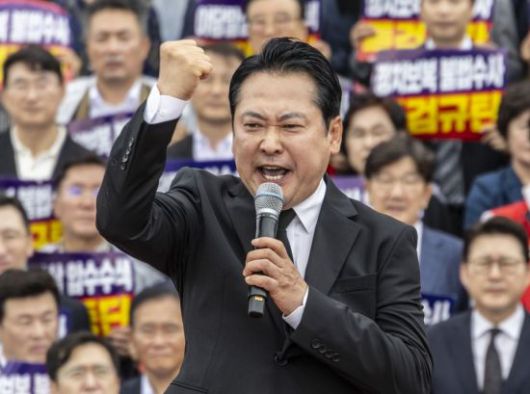 국민의힘 장동혁 대표가 4일 국회 본청 계단에서 열린 야당말살 정치탄압 특검수사 규탄대회에서 강력한 대 여당, 대 정부 투쟁을 선언하는 규탄 연설을 하고 있다. 연합뉴스 |