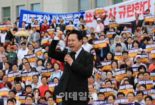 [이데일리 노진환 기자] 장동혁 국민의힘 당대표가 4일 오전 서울 여의도 국회 본청 앞 계단에서 열린 ‘야당말살 정치탄압 특검수사 규탄대회’에서 발언을 하고 있다. |