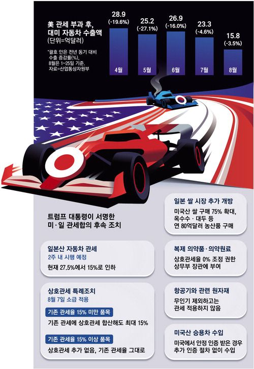 자동차 업계 관계자는 "미국으로 자동차를 수출하는 기업들이 더 이상 가격을 올리지 않고 버티기 어려운 상황일 텐데 일본 기업만 관세 부담이 줄면 한국 기업의 부담은 커질 수밖에 없다"며 "하루빨리 구체적인 합의문을 채택해 합의된 관세 인하를 앞당겨야 한다"고 말했다.