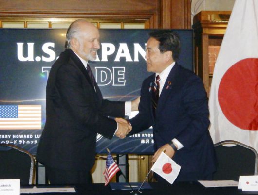 4일(현지시간) 미국 워싱턴DC에서 하워드 러트닉 미국 상무장관(왼쪽)과 아카자와 료세이 일본 경제재생상이 관련 문서에 서명한 뒤 악수를 하고 있다. 교도연합뉴스 |