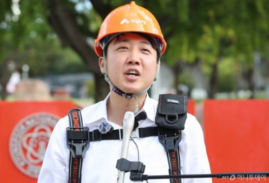 (대구=뉴스1) 공정식 기자 = 이준석 개혁신당 대표가 5일 오후 대구 북구 경북대학교 북문 앞에서 직접 고소작업차에 올라 당원모집 현수막을 설치한 뒤 취재진 질문에 답하고 있다. 2025.9.5/뉴스1 Copyright (C) 뉴스1. All rights reserved. 무단 전재 및 재배포, AI학습 이용 금지. /사진=(대구=뉴스1) 공정식 기자 |