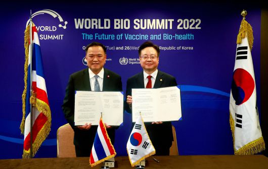 조규홍 전 보건복지부 장관이 서울 광진구 그랜드워커힐호텔에서 열린 식에서 아누틴 챤위라꾼 태국 부총리 당선인(왼쪽) 공중보건부 장관과 협약서에 서명 후 기념촬영을 하고 있다./보건복지부 제공 |