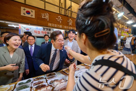 (서울=뉴스1) 허경 기자 = 이재명 대통령이 5일 인천 미추홀구 용현시장을 방문해 상인이 건낸 떡을 시식하고 있다. (대통령실 제공. 재판매 및 DB 금지) 2025.9.5/뉴스1neohk@news1.krCopyright ⓒ 뉴스1. All rights reserved. 무단 전재 및 재배포, AI학습 이용 금지.